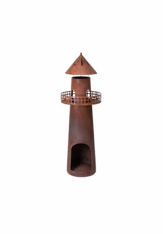 Stilvolle Feuerstelle in Leuchtturmform aus Metall im trendigen Rost-Look.