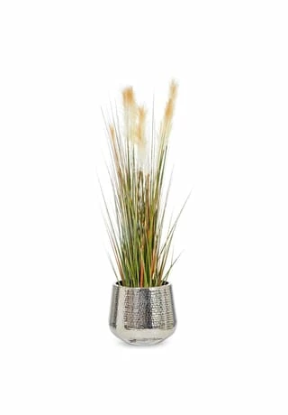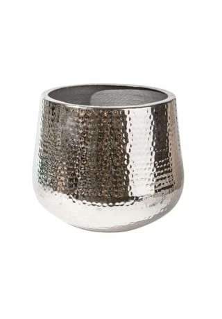 In diesem silberfarbenen Deko-Übertopf lassen sich Pflanzen wunderbar arrangieren.