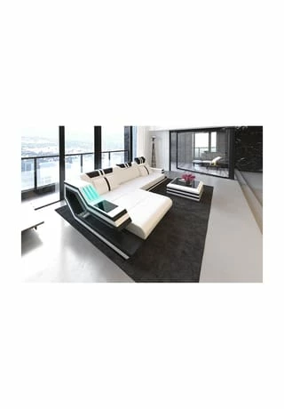 So modern das äußere Erscheinungsbild der Wohnlandschaft Ravenna ausfällt, so bequem ist das Sofa im täglichen Einsatz. Multifunktionale Kopfstützen und eine hochwertige Bonell Federung sorgen für herrlich entspannende Stunden. Die großzügig bemessene Liegefläche lädt zu einem kraftspendenden Schläfchen ein. Für den Bezug stehen Ihnen vier Lederarten zur Auswahl, von einer Mischung aus Echt- und Kunstleder bis hin zu besonders weichem Büffelleder. Jede dieser Varianten erhalten Sie in verschiedenen attraktiven Farben. Falls Sie das Ledersofa Ravenna um ein Gästebett erweitern möchten, bestellen Sie es einfach inklusive Schlaffunktion. Sogar einen passenden Couchtisch haben wir auf Lager. Damit ist Ihre moderne Ruheoase perfekt. Luxus-Kunstleder: Alle beanspruchten Teile, wie die Sitzflächen und Rückenlehnen, werden mit echtem Italienischen Leder bezogen. Hochwertiges Nappa Leder mit schöner Narbung und Weichheit. Die Rückseite, Seitenteile oder bodennahe Zierstreifen, werden durch ein farblich passendes ?Soft Life Premium” Kunstleder ergänzt (100% PU) Kunstleder: Das hochwertige Soft Life Premium Kunstleder hat eine feine Ledernarbung und einen weichen Textilrücken. Das Leder ist UV-beständig, hautverträglich, schweißbeständig und wasserabweisend. (100% PU) Long-Life-Leder LONG Hochwertiges Rindsleder aus Italien mit feiner Narbung und exzellenten Eigenschaften. Es ist besonders weich und nur mit einer leichten Pigmentierung versehen. Leder BULL Premium Dickleder der höchsten Qualität. Es besticht vor allem durch seine Weichheit und seinen unverwechselbaren Charakter. Mit einer Stärke von 1,4 1,6 mm und seiner typischen Narbenstruktur genügt es höchsten Ansprüchen. Die Qualität unseres Büffelleders ist deutlich zu sehen und vor allem zu spüren.