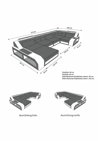 Beleuchtung Energieeffizienzklasse: Geeignet für Leuchtmittel der Skala A++ bis E Beleuchtung Modellkennung: 50502 Breite: 373 cm Länge: 197 cm Höhe: 86 cm Sitzhöhe: 40 cm Sitztiefe: 60 cm Maße-Skizze: siehe Bildergalerie Farben: Bei einer Farbkombination wie zum Beispiel “rot-weiß” ist die erste Farbe (rot) immer die Hauptfarbe, welche den Großteil des Sofas ausmachen wie Sitzflächen und Rückenlehnen. Bei der Zweitfarbe (weiss) handelt es sich um eine Akzentfarbe, welche zum Beispiel die Zierstreifen oder Kopfstützen haben. Bezugsstoffbeschreibung: Luxus-Kustleder = ECHT-/KUNSTLEDER MIX Bei dieser Version werden alle unmittelbar beanspruchten Teile, wie die Sitzflächen und Rückenlehnen, mit echtem italienischen Rindsleder bezogen. Bei diesem Material handelt es sich um ein hochwertiges Nappa Leder, welches vor allem wegen seiner schönen Narbung und seiner Weichheit von vielen Polstermöbel Herstellern benutzt wird. Um Ihnen gleichzeitig einen attraktiven Preisvorteil zu ermöglichen, werden bei dieser Bezugsvariante die nicht unmittelbar beanspruchten Teile, wie z.B. die Rückseite, Seitenteile oder bodennahe Zierstreifen und Armlehnen, durch ein farblich passendes ?Soft Life Premium” Kunstleder ergänzt. Kunstleder = KUNSTLEDER PREMIUM Bei dieser Variante fertigen wir Ihr Sofa komplett in einem hochwertigen Kunstleder an. Unser Soft Life Premium Kunstleder hat eine feine Ledernarbung und einen weichen Textilrücken. Das Leder ist UV-beständig und wird aufgrund seiner hohen Qualität und Beständigkeit auch von vielen namhaften Möbelherstellern verwendet. Es ist besonders hautverträglich, schweißbeständig, wasserabweisend und reißfest. Long-Life-Leder Long = ECHTLEDER PREMIUM Bei dieser Ausführung wird das Sofa vollständig mit echtem italienischem Nappaleder bezogen. Es handelt es sich hierbei um ein hochwertiges Rindsleder aus Italien mit feiner Narbung und exzellenten Eigenschaften. Es ist besonders weich und nur mit einer leichten Pigmentierung versehen, um die Oberfläche gegen das Eindringen von Flüssigkeit und gegen Verschmutzungen besser zu schützen. Das Material besitzt beste Eigenschaften, Komfort, Design oder Materialstärke, die Ihre Polstermöbel zu einem Erlebnis werden lassen, an dem Sie sich dauerhaft erfreuen können. Leder Bull = BÜFFELLEDER PREMIUM Bei unserem exklusiven Büffelleder handelt es sich um ein Premium Dickleder der höchsten Qualität. Es besticht vor allem durch seinen unglaublichen Sitzkomfort, seine Weichheit und seinen unverwechselbaren Charakter. Mit einer Stärke von 1,4 1,6 mm und seiner typischen Narbenstruktur genügt es höchsten Ansprüchen. Die Qualität unseres Büffelleders ist deutlich zu sehen und vor allem zu spüren und es erfreut sich gerade bei Kennern sehr großer Beliebtheit. Büffelleder belohnt mit authentischer Leder – Optik und einem unvergleichlichen Sitzerlebnis. Ein Material mit Stil und Charakter für echte Leder Liebhaber.