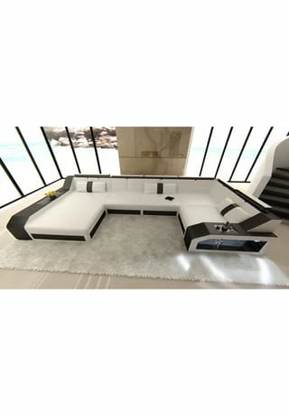 Beleuchtung Energieeffizienzklasse: Geeignet für Leuchtmittel der Skala A++ bis E Beleuchtung Modellkennung: 50502 Breite: 373 cm Länge: 197 cm Höhe: 86 cm Sitzhöhe: 40 cm Sitztiefe: 60 cm Maße-Skizze: siehe Bildergalerie Farben: Bei einer Farbkombination wie zum Beispiel “rot-weiß” ist die erste Farbe (rot) immer die Hauptfarbe, welche den Großteil des Sofas ausmachen wie Sitzflächen und Rückenlehnen. Bei der Zweitfarbe (weiss) handelt es sich um eine Akzentfarbe, welche zum Beispiel die Zierstreifen oder Kopfstützen haben. Bezugsstoffbeschreibung: Luxus-Kustleder = ECHT-/KUNSTLEDER MIX Bei dieser Version werden alle unmittelbar beanspruchten Teile, wie die Sitzflächen und Rückenlehnen, mit echtem italienischen Rindsleder bezogen. Bei diesem Material handelt es sich um ein hochwertiges Nappa Leder, welches vor allem wegen seiner schönen Narbung und seiner Weichheit von vielen Polstermöbel Herstellern benutzt wird. Um Ihnen gleichzeitig einen attraktiven Preisvorteil zu ermöglichen, werden bei dieser Bezugsvariante die nicht unmittelbar beanspruchten Teile, wie z.B. die Rückseite, Seitenteile oder bodennahe Zierstreifen und Armlehnen, durch ein farblich passendes ?Soft Life Premium” Kunstleder ergänzt. Kunstleder = KUNSTLEDER PREMIUM Bei dieser Variante fertigen wir Ihr Sofa komplett in einem hochwertigen Kunstleder an. Unser Soft Life Premium Kunstleder hat eine feine Ledernarbung und einen weichen Textilrücken. Das Leder ist UV-beständig und wird aufgrund seiner hohen Qualität und Beständigkeit auch von vielen namhaften Möbelherstellern verwendet. Es ist besonders hautverträglich, schweißbeständig, wasserabweisend und reißfest. Long-Life-Leder Long = ECHTLEDER PREMIUM Bei dieser Ausführung wird das Sofa vollständig mit echtem italienischem Nappaleder bezogen. Es handelt es sich hierbei um ein hochwertiges Rindsleder aus Italien mit feiner Narbung und exzellenten Eigenschaften. Es ist besonders weich und nur mit einer leichten Pigmentierung versehen, um die Oberfläche gegen das Eindringen von Flüssigkeit und gegen Verschmutzungen besser zu schützen. Das Material besitzt beste Eigenschaften, Komfort, Design oder Materialstärke, die Ihre Polstermöbel zu einem Erlebnis werden lassen, an dem Sie sich dauerhaft erfreuen können. Leder Bull = BÜFFELLEDER PREMIUM Bei unserem exklusiven Büffelleder handelt es sich um ein Premium Dickleder der höchsten Qualität. Es besticht vor allem durch seinen unglaublichen Sitzkomfort, seine Weichheit und seinen unverwechselbaren Charakter. Mit einer Stärke von 1,4 1,6 mm und seiner typischen Narbenstruktur genügt es höchsten Ansprüchen. Die Qualität unseres Büffelleders ist deutlich zu sehen und vor allem zu spüren und es erfreut sich gerade bei Kennern sehr großer Beliebtheit. Büffelleder belohnt mit authentischer Leder – Optik und einem unvergleichlichen Sitzerlebnis. Ein Material mit Stil und Charakter für echte Leder Liebhaber.