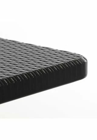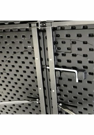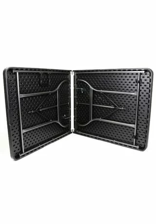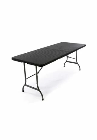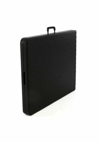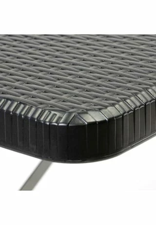 Dieser schwarze Klapptisch sticht mit seinem edlen Design in Rattanoptik hervor. Der Tisch ist im Handumdrehen aufgebaut, und für einen sicheren Halt werden an der Unterseite Sicherheitsstifte angebracht. Auch zur Party können Sie diesen Tisch mitnehmen, dank des integrierten Tragegriffs ist er leicht zu transportieren. Wird der Partytisch nicht mehr benötigt lässt er sich platzsparend verstauen. Das Material ist pflegeleicht und lässt sich einfach abwischen. Somit ist er sowohl für Innen- als auch für den Außenbereich geeignet. So steht Ihrer Feierlichkeit nichts mehr im Weg. Material: Metallgestell / Hartplastikplatte mit Rattan-Optik Maße: ca. 180 x 75 x 70 cm Maße zusammengeklappt: 89 x 75 x 8 cm Plattenstärke ca. 3,5 cm belastbar bis ca. 170 kg mit Tragegriff zum einfachen Transport klappbar